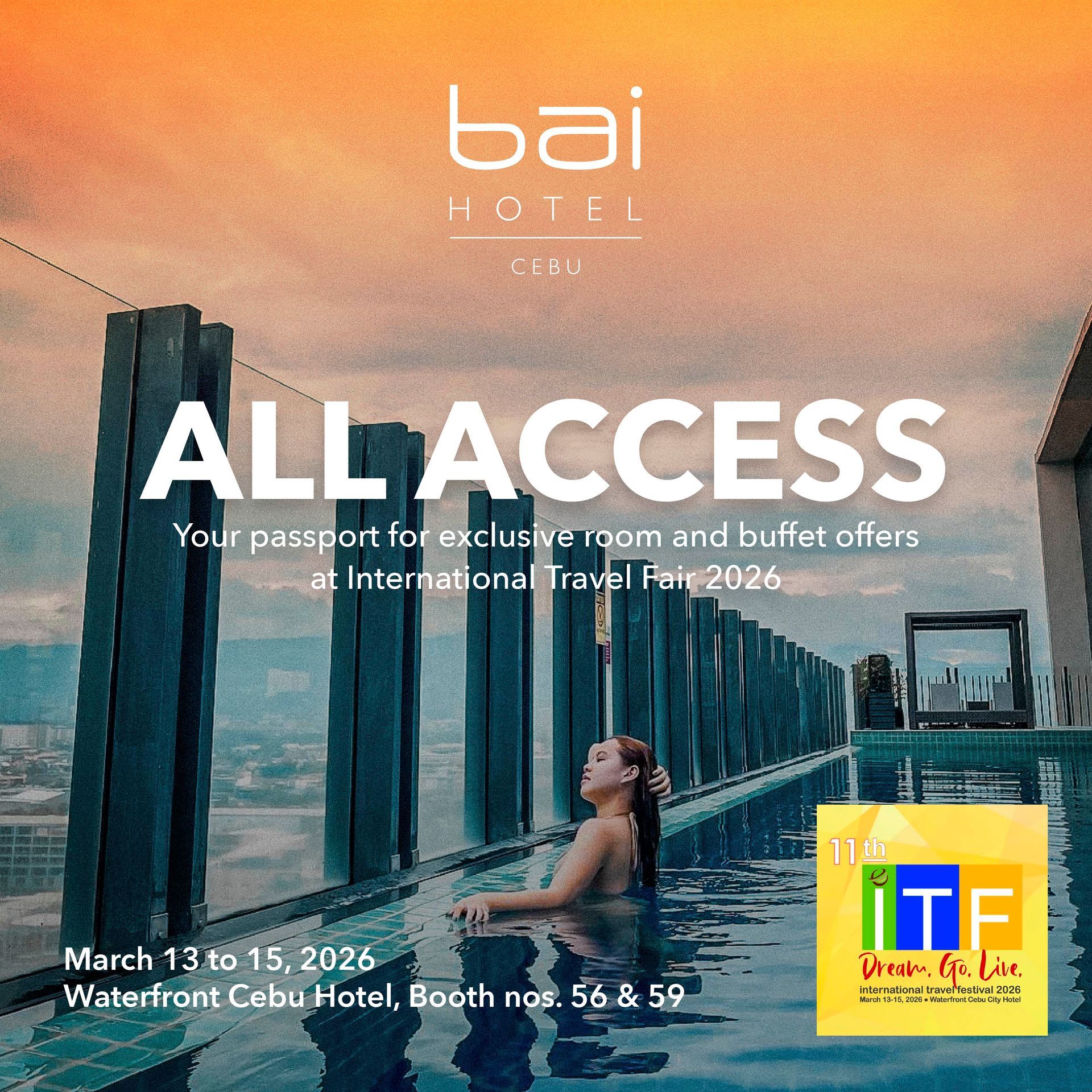bai Hotel Cebu is bringing unbeatable deals to the 11th International Travel Fair 2026! Visit us from March 13–15, 2026 at Booth 56 and 59, Waterfront Cebu City Hotel, and discover offers you won't find anywhere else.