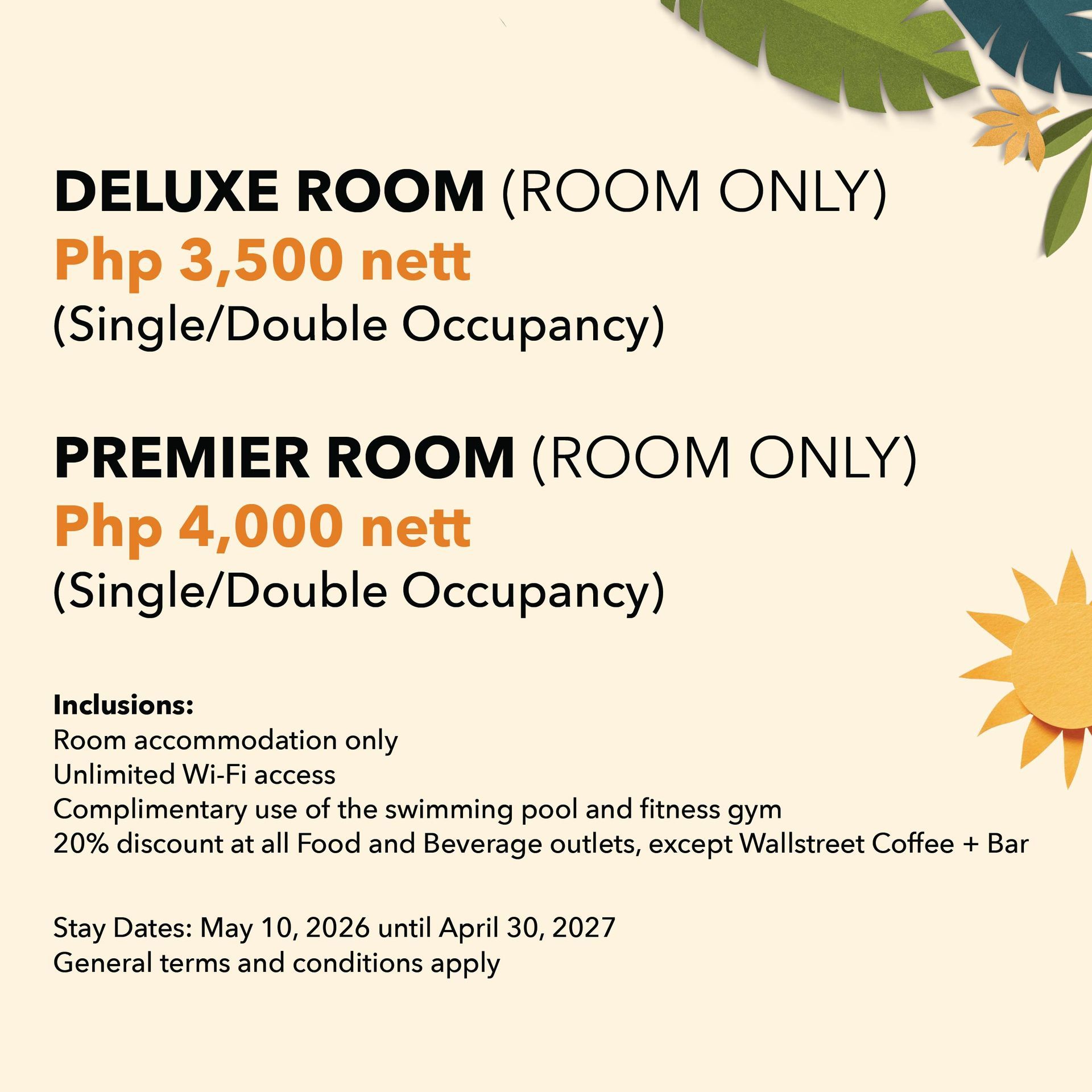 - A maximum of 2 kids per room may stay for free (11 years old and below), provided they share beds with their parents (meals not included).